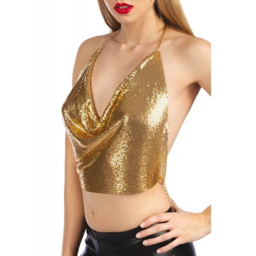 Este top de malha dourada sem costas, é a peça que faltava na sua coleção. É tão versátil que pode usá-lo com a sua toilette ou simplesmente sob a pele nua. Destaque o seu corpo e torne-se o centro das atenções para onde quer que vá.