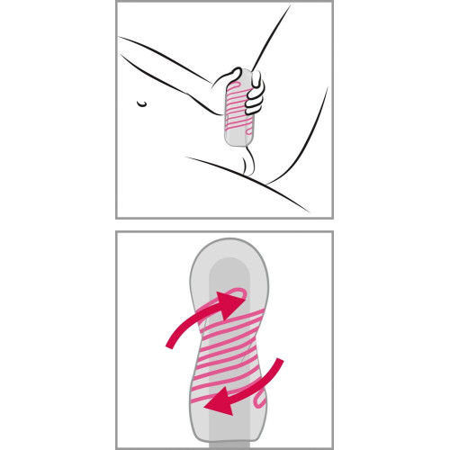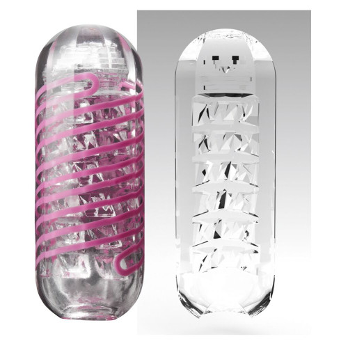 Masturbador transparente e reutilizável Spinner da TENGA com uma bobina integrada que faz com que o masturbador se torça durante a penetração (Internal Coil Mechanism). A manga apresenta uma espiral de azulejos arrojados e impactantes.