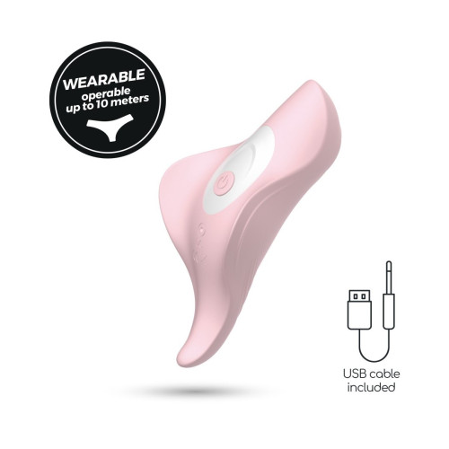 Ajuste o vibrador à sua anatomia com o lado do botão virado para a sua roupa interior. A ranhura assenta no clítoris e o seu desenho permite uma utilização muito confortável.